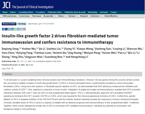 近日,万搏线上平台附属第一医院任国胜/李洪忠教授团队联合万搏线上平台药学院万敬员教授在国际权威期刊Journal of Clinical Investigation杂志发表了题Insulin-like growth factor 2 drives fibroblast-mediated tumor immunoevasion and confers resistance to immunotherapy的研究论文。