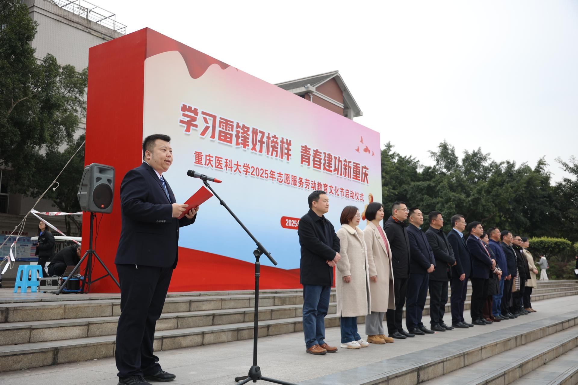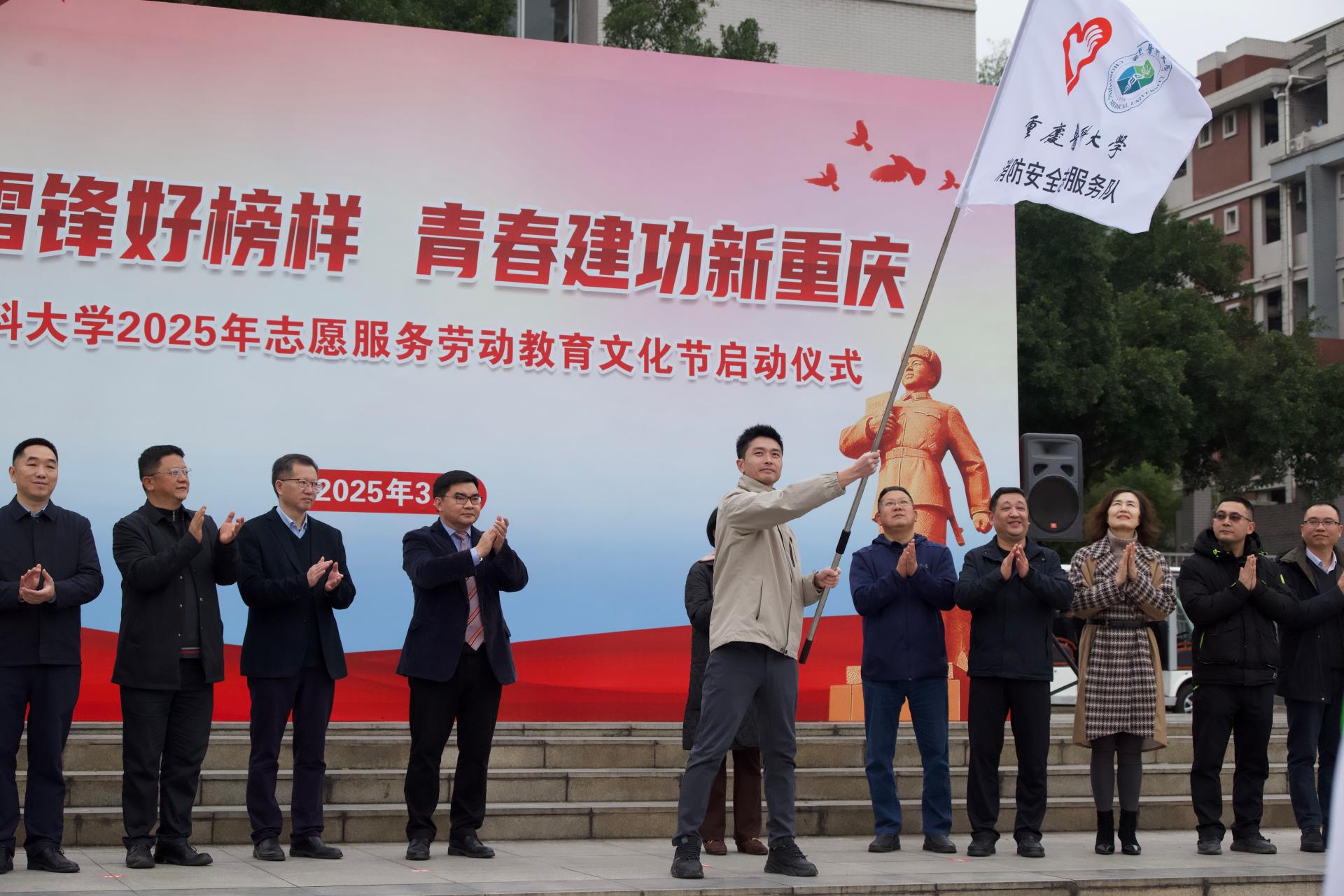 袁军在仪式活动上发表了热情洋溢的讲话。他充分肯定了万搏线上平台志愿服务的丰硕成果,表示志愿服务活动不仅是万搏线上平台社会实践育人的重要载体,更是学生践行社会主义核心价值观的关键途径,大家在实践中学会了感恩、责任与担当。他代表万搏线上平台党政向长期投身志愿服务的师生致以崇高敬意,并提出了三点要求。一是要学史增信,深刻把握雷锋精神的时代内涵。全体重医师生要以雷锋为榜样,将践行社会主义核心价值观融入思想与行动,传承精神火炬,凝聚奋进力量。二是要守正创新,深度融入雷锋精神的历史厚度。希望大家继往开来,立足专业优势,科学规划实践项目,丰富服务内容,强化宣传保障,打造“重医特色”志愿服务品牌,在新时代拓展雷锋精神内涵,贡献重医智慧。三是要久久为功,不断绽放雷锋精神的璀璨光芒。师生们要在“大思政”课堂与时代浪潮中主动作为,携手共进,用青春志愿续写雷锋故事,用唯实争先锻造筋骨才干,用医者仁心守卫人民健康,为建功新重庆、构建和谐美好的社会贡献力量。