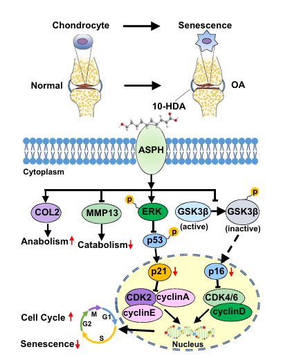 研究团队率先发现并证实一种来源于蜂王浆的天然小分子化合物10-羟基-2-癸烯酸(10-HDA)具有软骨保护作用,分别从细胞、组织、临床样本、不同小鼠模型等多个层面证实10-HDA能够抑制软骨退化并缓解小鼠的疼痛,同时确定10-HDA通过靶向天冬酰胺β-羟化酶(ASPH)的Asp_Arg_Hydrox结构域的糖基化位点调节软骨代谢、发挥保护作用,通过ERK/p53/p21和GSK3β/p16途径抑制软骨细胞衰老进而延缓软骨的退化。这些发现不仅明确10-HDA可以通过抑制软骨细胞衰老有效治疗骨关节炎,为未来关于10-HDA/ASPH相互作用的研究奠定基础,而且拓宽了我国中医药传统医学的研究视野,揭示10-HDA可能是一种有前途的治疗骨关节炎的靶向药物。