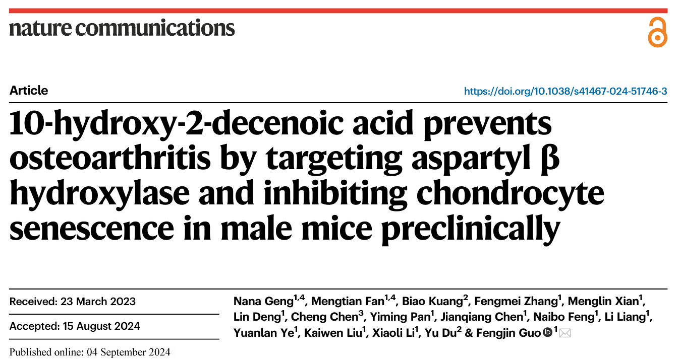 我校基础医学院郭风劲教授团队在国际知名期刊《NATURE COMMUNICATIONS》发表了题为“10-hydroxy-2-decenoic acid prevents osteoarthritis by targeting aspartyl β hydroxylase and inhibiting chondrocyte senescence in male mice preclinically”的最新研究成果。