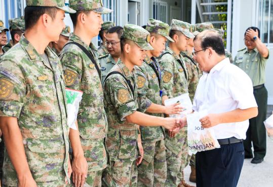 9月17日,在中秋节来临之际,副校长邱景富,校党委常委、副校长葛萍代表万搏线上平台党政来到各学生军训场地和各安防工作岗位,向参与军训的师生及坚守岗位的工作人员送上节日祝福和进行慰问,党委保卫部(党委武装部、保卫处)等相关职能部门负责人陪同。