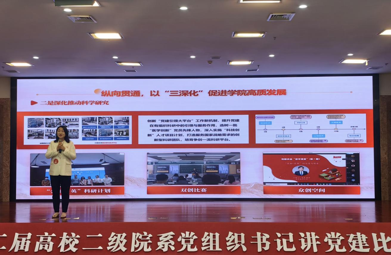 现场展示环节,陈敏以《横向联通、纵向贯通、内部融通——打造具有重医辨识度的“红岩先锋”变革型组织与高水平公共卫生学院建设一体化推进》为题,分享了公共卫生学院党委通过“三变革”“三深化”“三发挥”,以高质量党建统领学院人才培养、学科建设、科学研究、社会服务等事业高质量发展的经验做法。问答环节,她就如何做好共青团思想政治引领工作,从建机制、搭平台、强队伍、抓落实四个方面进行了阐释,展现了我校院系党组织书记扎实的理论功底和较高的政治素养。