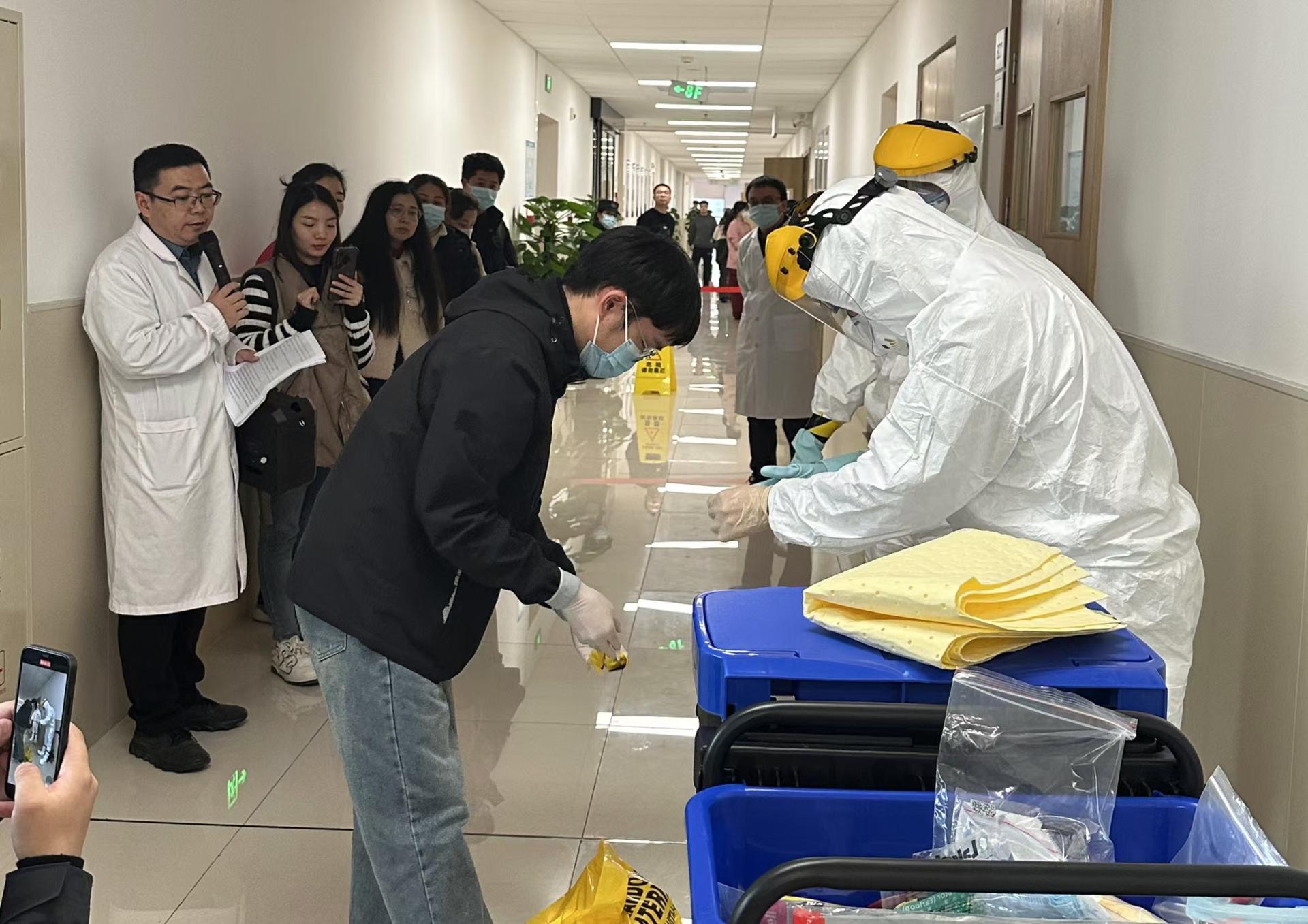 应急演练环节在崇医楼807实验室进行。通过模拟实验人员在转移病毒培养物的器皿时,不慎摔碎培养皿,污染实验室地面的场景,开展应急消毒、人员撤离、隔离、警戒、事故报告、封闭实验、事故实验室消毒、恢复实验等应急处置。通过专业指导、参演师生示范,观摩人员详细学习了生物安全防护意识及应对突发事件的正确处置流程。