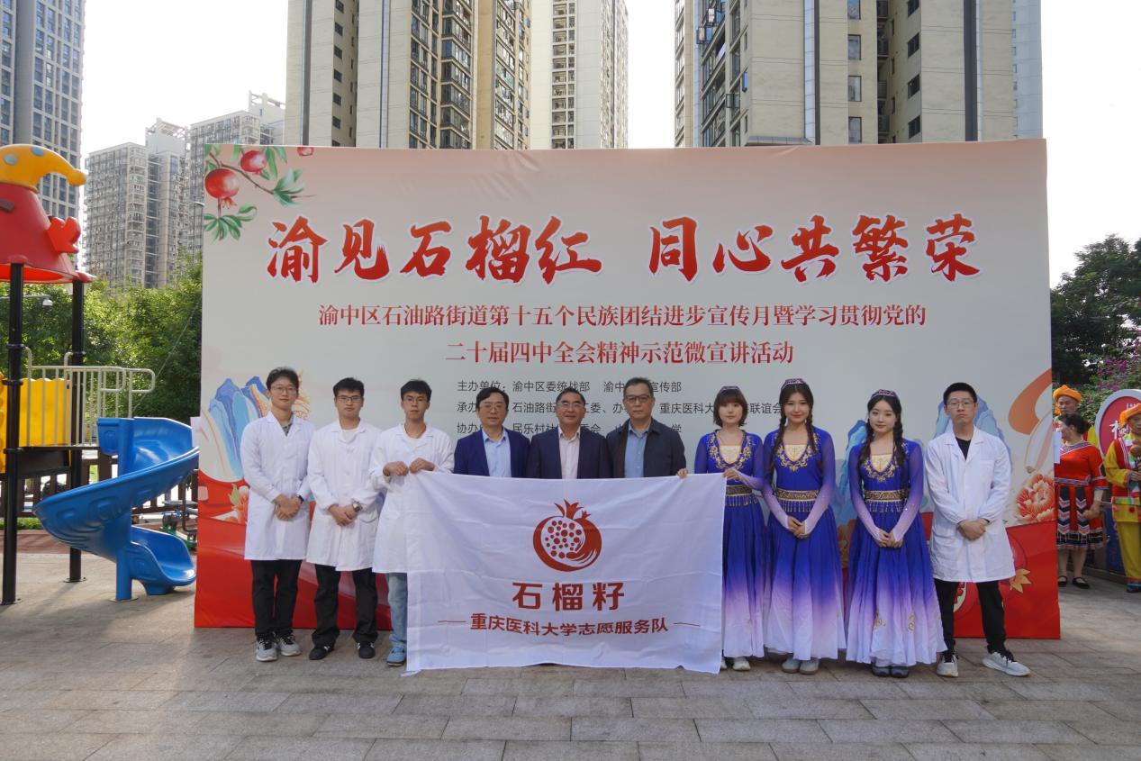 10月22日,由渝中区委统战部、区委宣传部主办,石油路街道党工委、办事处,万搏线上平台少数民族联谊会承办的“渝见石榴红·同心共繁荣”民族团结进步宣传周暨学习贯彻党的二十届四中全会精神示范微宣讲活动,在渝中区石油路街道民乐村社区文化体育公园举行。万搏线上平台党委常委、统战部部长梁柱俊,校少数民族联谊会会长、公共卫生学院副院长尹定洪及民族师生代表参加活动。