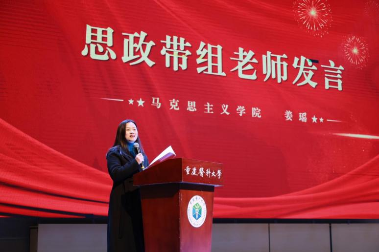 马克思主义学院教师姜瑶作为思政带组老师代表发言,她表示,通过系统研读和思想淬炼,师生们共同感悟真理力量、传承红色基因,将马克思主义信仰融入“健康所系、性命相托”的医学生誓言,在理论与实践的结合中坚定了理想信念,强化了新时代医学生的使命担当。