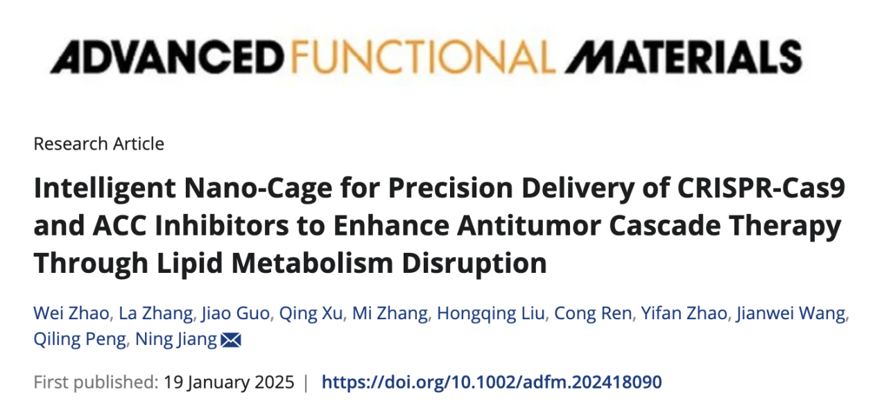 近日,我校基础医学院蒋宁副教授作为唯一通讯在国际权威期刊Advanced Functional Materials发表了题为Intelligent Nano-Cage for Precision Delivery of CRISPR-Cas9 and ACC Inhibitors to Enhance Antitumor Cascade Therapy Through Lipid Metabolism Disruption的最新研究成果。