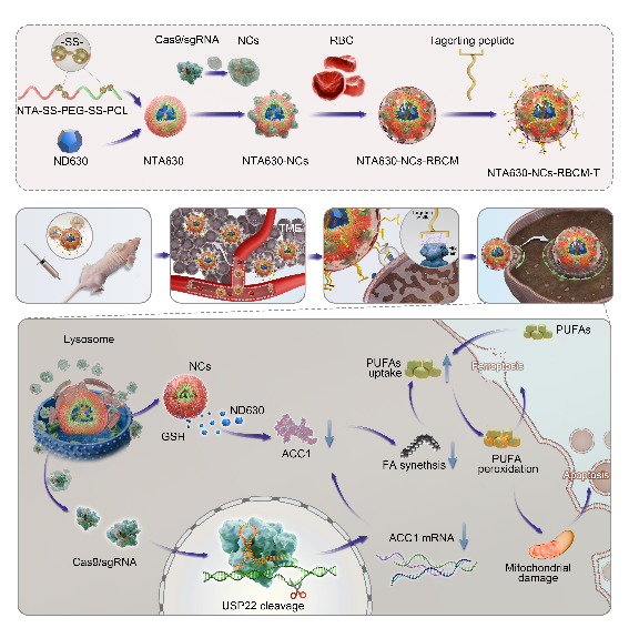 蒋宁团队设计了一种新型纳米笼,利用靶向肽修饰的红细胞膜实现精准靶向,将CRISPR-Cas9基因编辑工具和ACC1抑制剂递送至癌细胞(命名为NTA630-NCs-RBCM-T),从而实现对脂肪酸合成关键酶ACC1的双重抑制。这种双层抑制策略结合了基因敲除和蛋白层面直接作用,显著抑制了癌细胞内脂肪酸的合成;与此同时,团队发现癌细胞内的脂肪酸合成减少反而导致其对多不饱和脂肪酸的摄取增加,触发脂质过氧化反应,进而引发铁死亡和细胞凋亡。这一治疗方法不仅干扰了癌细胞的代谢过程,还最大化了抗肿瘤级联疗法的效果,为癌症治疗开辟了新的希望。研究中开发的双层抑制策略为更高效、更靶向的癌症治疗提供了新的思路。