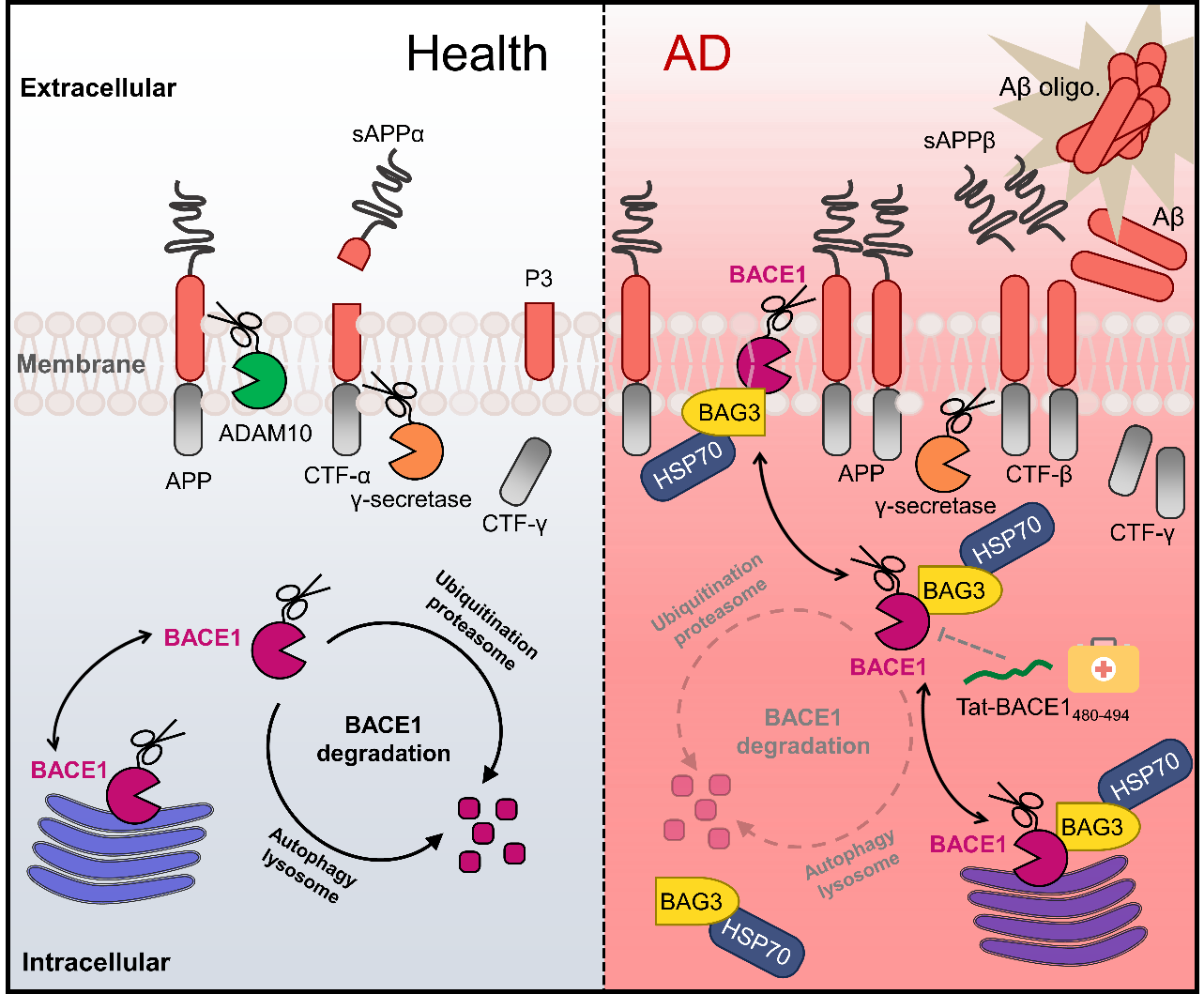 阿尔茨海默病(Alzheimer's disease, AD)是最常见的中枢神经系统退行性疾病,其发病机制复杂且目前缺乏有效治疗手段。β-淀粉样蛋白(Aβ)沉积是AD的典型病理特征,而β-位点APP裂解酶1(BACE1)作为Aβ生成的关键限速酶,一直是AD治疗研究的重要靶点。然而,由于BACE1在生理功能中的重要作用,传统抑制剂开发面临巨大挑战,既往临床试验均未取得突破性进展。该研究创新性地聚焦于热休克蛋白HSP70的协同分子伴侣BAG3,发现其在AD病理过程中异常稳定BACE1的新机制。研究发现,BAG3通过与HSP70、BACE1形成三元复合物,抑制BACE1的泛素化-蛋白酶体降解和自噬-溶酶体降解途径,从而维持BACE1的稳定性并促进Aβ生成。基于这一发现,研究团队成功解析了BACE1与BAG3的特异性结合位点,并据此开发出新型Tat-BACE1多肽药物。该药物能竞争性结合BAG3,有效阻断BAG3-BACE1相互作用,显著降低BACE1蛋白水平和Aβ产生。动物实验证实,该治疗策略可明显改善AD模型小鼠的突触和认知功能。