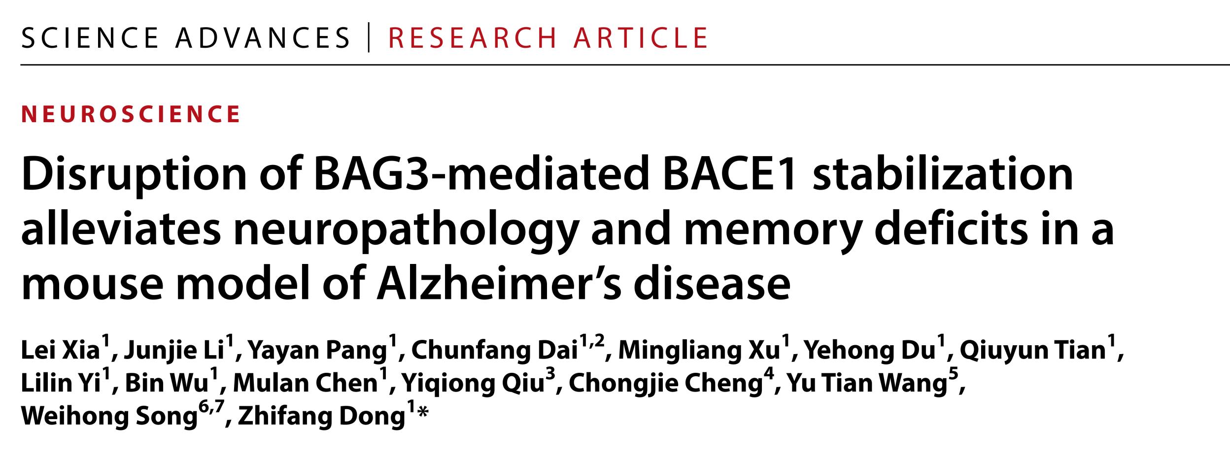 5月23日,万搏线上平台附属儿童医院董志芳教授团队在Science Advances发表了题为Disruption of BAG3-mediated BACE1 stabilization alleviates neuropathology and memory deficits in a mouse model of Alzheimer's disease的研究论文。