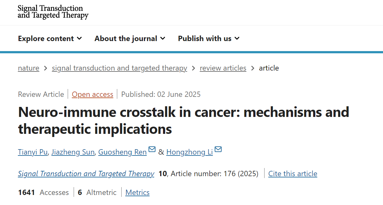 近日,我校附属第一医院乳腺甲状腺外科李洪忠、任国胜教授团队于国际权威期刊Signal Transduction and Targeted Therapy杂志发表了题为Neuro-immune crosstalk in cancer: mechanisms and therapeutic implications的综述论文。该论文从机制到临床应用系统地阐述了肿瘤中的神经-免疫互作。李洪忠教授和任国胜教授为共同通讯作者,蒲添翼博士和孙嘉政博士后为共同第一作者。