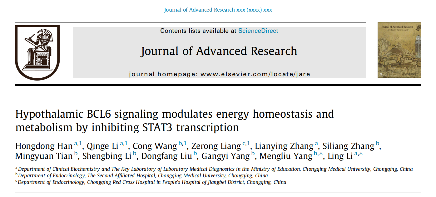 近日,我校检验医学院李伶教授与附二院内分泌代谢病科杨梦柳副研究员联合团队的研究,报道了下丘脑POMC神经元中BCL6对机体系统能量代谢稳态及糖脂代谢的关键调控作用及其中涉及的分子机制,研究成果以题为Hypothalamic BCL6 signaling modulates energy homeostasis and metabolism by inhibiting STAT3 transcription的论著形式发表在Journal of Advanced Research.
