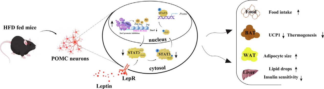 本研究发现,饮食诱导的肥胖(DIO)和遗传性肥胖小鼠下丘脑ARC区BCL6表达显著上调,该区域POMC神经元BCL6过表达促进了DIO小鼠肥胖表型(体重增加、产热受损、肝脏脂质积累及胰岛素抵抗等)。反之,POMC神经元中BCL6特异性敲除可促进能量消耗,缓解这些肥胖表型。机制层面,研究团队阐明了BCL6通过SIRT1介导H4K16ac及H1.4K26ac组蛋白去乙酰化修饰,抑制STAT3的转录表达,继而下调瘦素信号转导的关键分子机制(图1)。该研究为肥胖的治疗提供了潜在的干预靶点,具有重要的理论意义与临床转化价值。